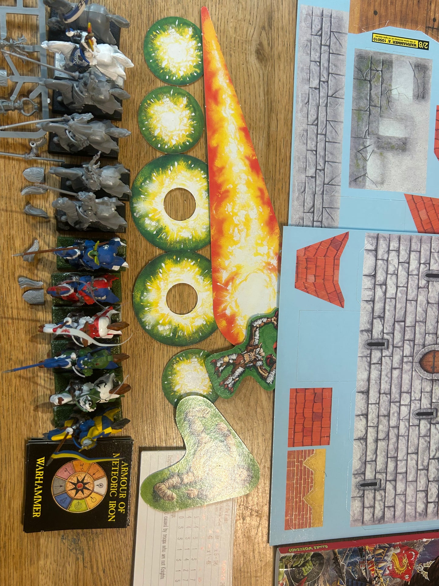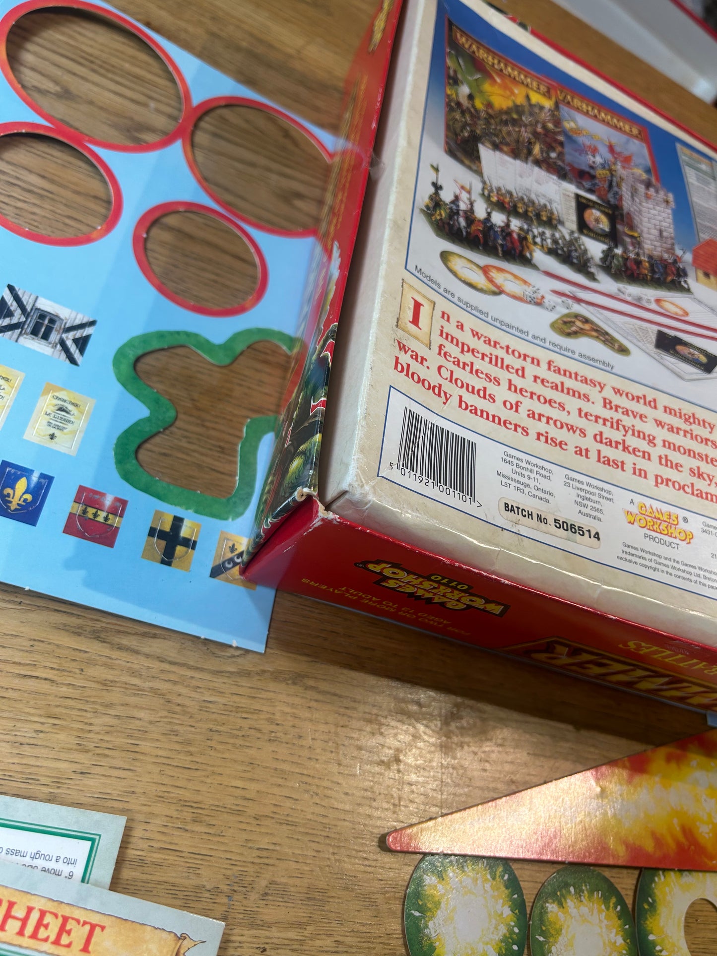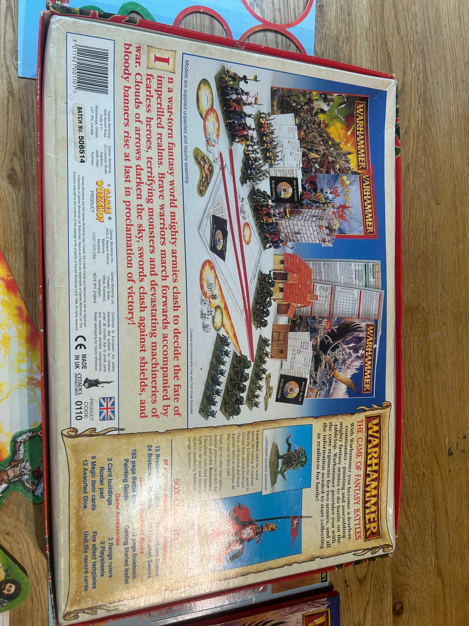 Has all the miniatures, rules and components but none of the extra alternative bits from the sprues. Has been made up using different box sets so the skink ans saurus warriors might not have the exact ratio of sculpts from the original box. Four tails need gluing onto knights. One saurus head and one arm have snapped off an need regluing. Box has some wear and a little denting. Rules have wear but are complete. Rosters sheets have about 1/4 left.